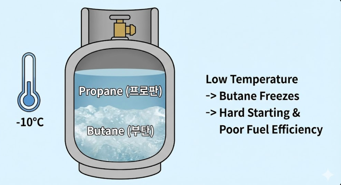 - 연료 기화 성능 저하: 낮은 온도에서는 LPG가 충분히 기화되지 않아 연비가 감소합니다.